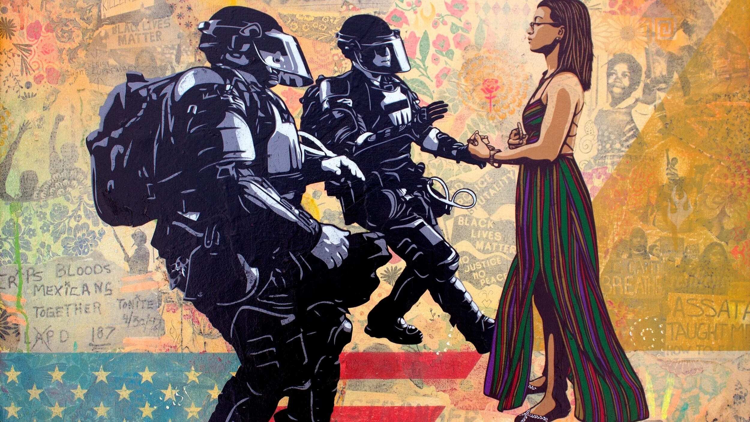 Ernesto Yerena Montejano uses his cross-national upbringing and graphic design practice to bring attention to the issues faced by Indigenous and Brown people. Montejano produces political and social justice images using the bright colors that draw inspiration from California's psychedelic art, as well as the bright colors and geometric aesthetic of Native American and Mexican cultures.
